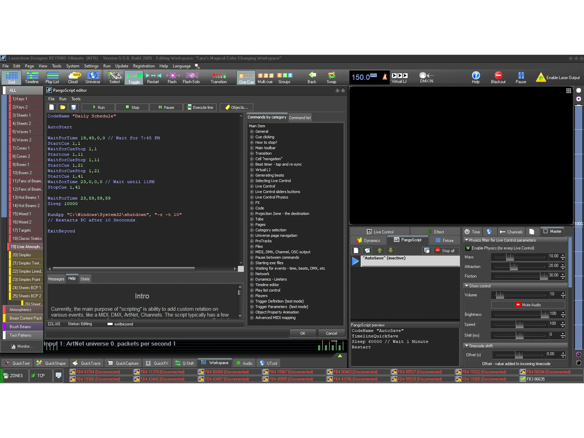 PangoScript - PangoScript ist ein Werkzeug innerhalb von BEYOND, mit dem Sie auf die Kernfunktionen der Software zugreifen und diese an Ihre Bedürfnisse anpassen können. Mit PangoScript können Sie individuelle Codebefehle schreiben, um fast jede denkbare Funktion auszuführen. Wenn Sie beispielsweise eine MIDI-, DMX- oder Lichtkonsole zuordnen und anpassen möchten, was jeder Regler, Knopf und Schieberegler tut, können Sie ein "PangoScript" für diese Funktionen schreiben.Klicken Sie hier, um mehr zu erfahren.